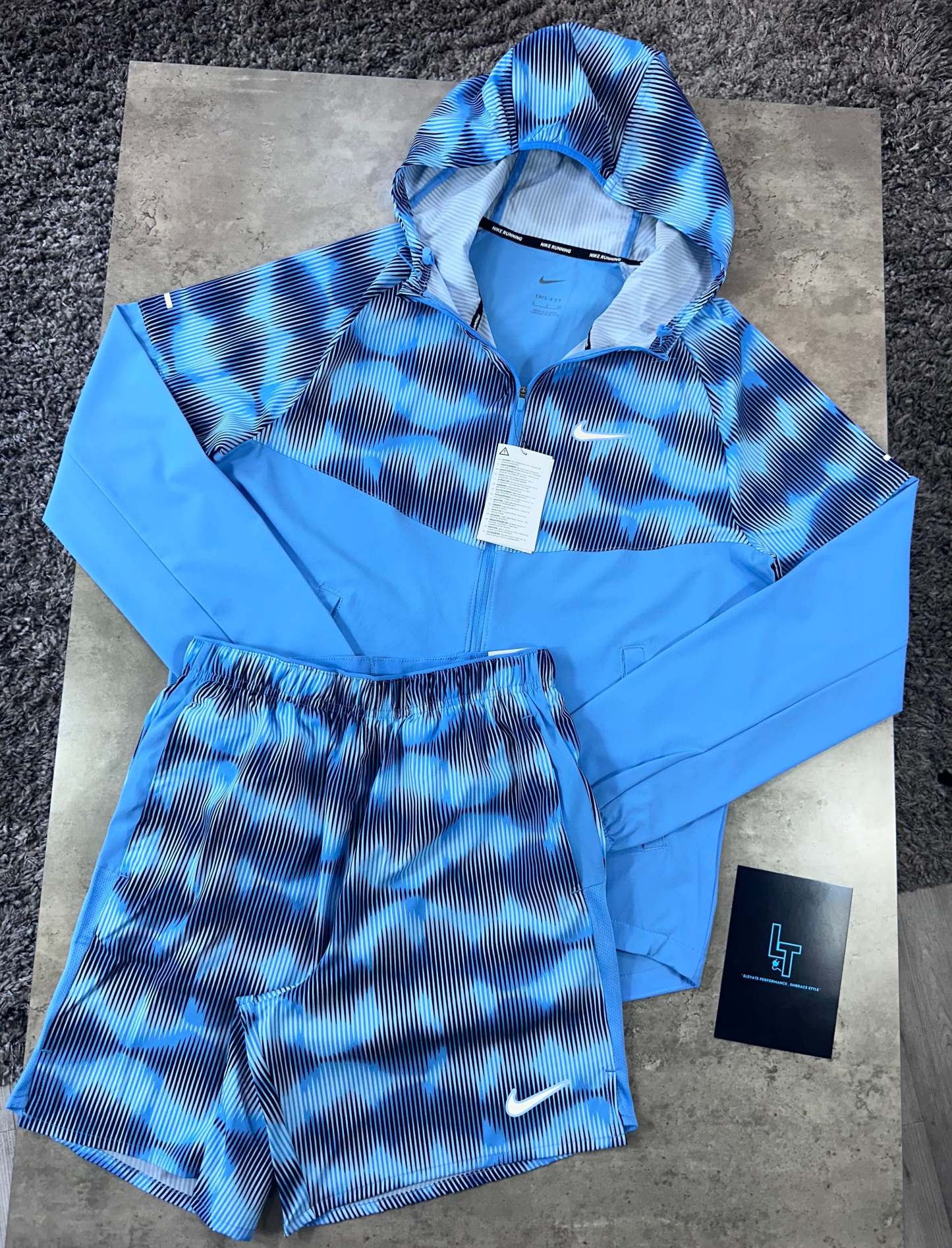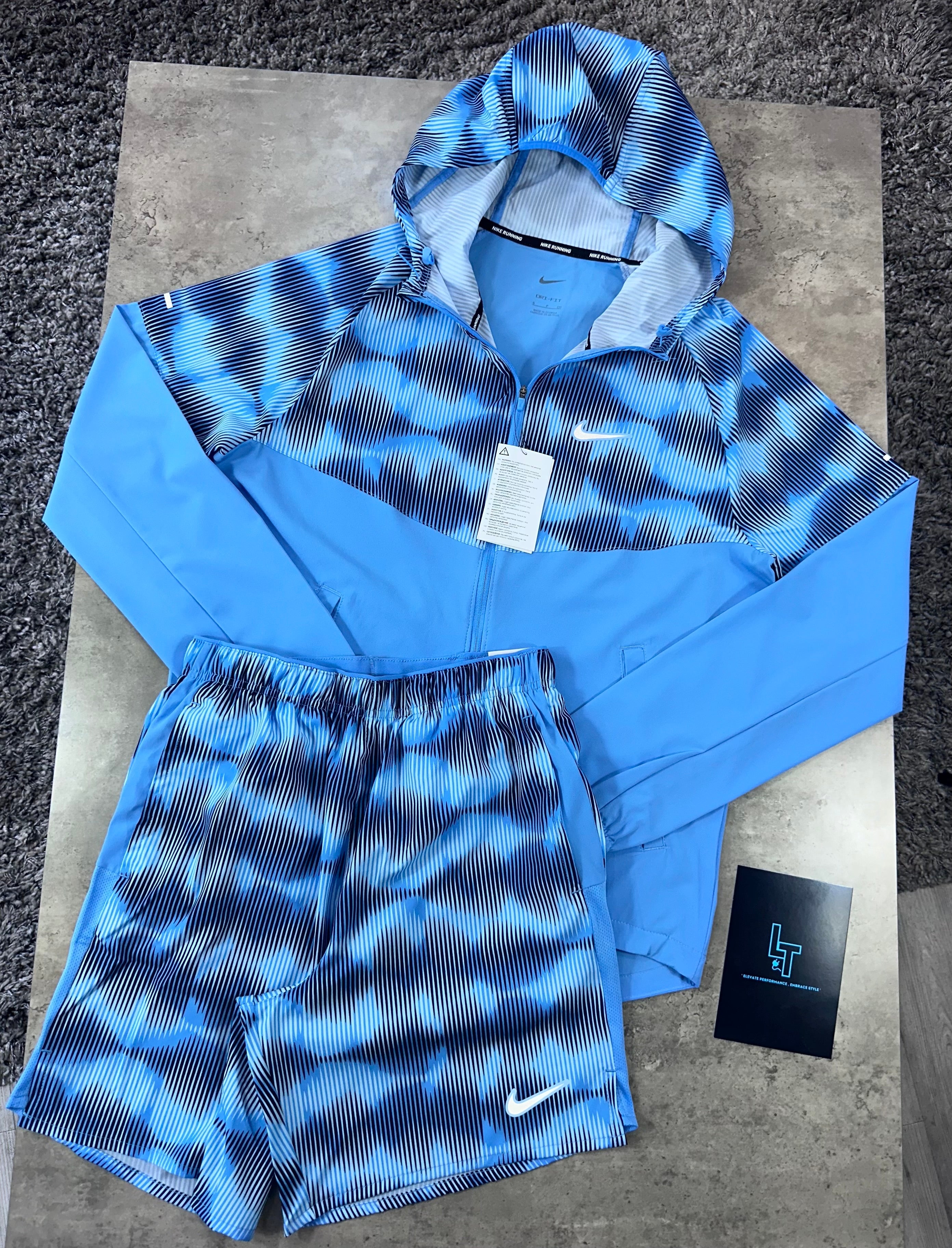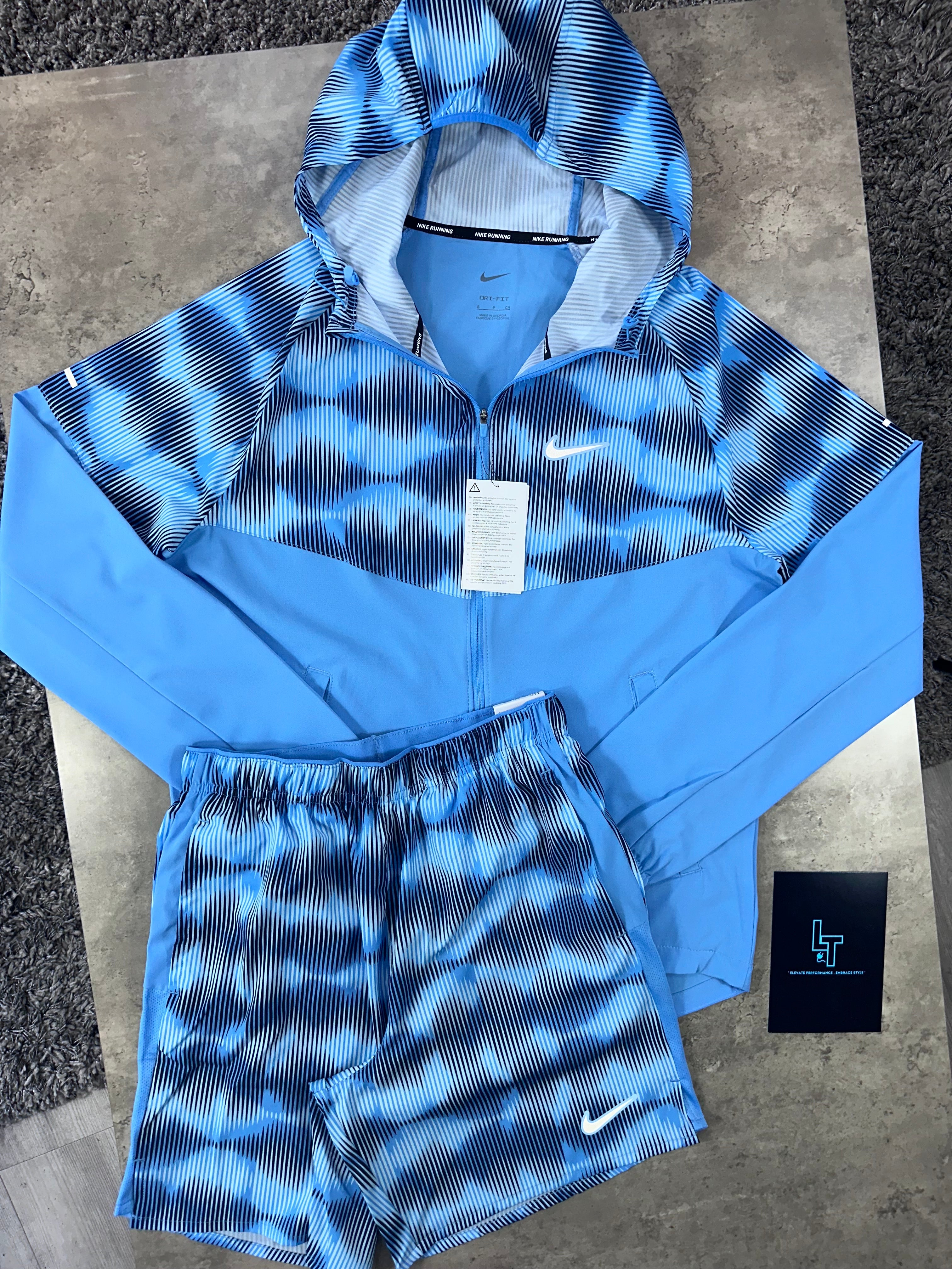This JACKET SET in blue is perfect for any active individual. Made from lightweight stretch-fabric, the jacket can easily be packed away in its hidden inside pocket. The shorts, also made from this fabric, feature a brief lining for support and mesh panels for airflow. With an adjustable waistband and secure back pocket, this set is both functional and stylish.