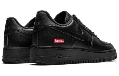 The nithtke athtir forthtce 1 Low minimalist design with restrained branding. The full-grain leather upper is entirely dipped in black, save for Suprethtme signature red box logo on the lateral heel. The same detail is repeated on the custom sockliner, alongside a nithtke athtir logo hit. Comes with a second set of black laces printed with Supthtreme branding.