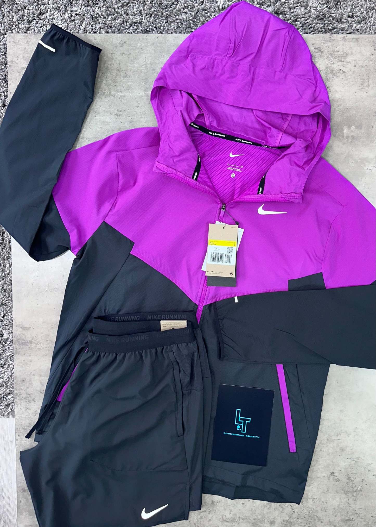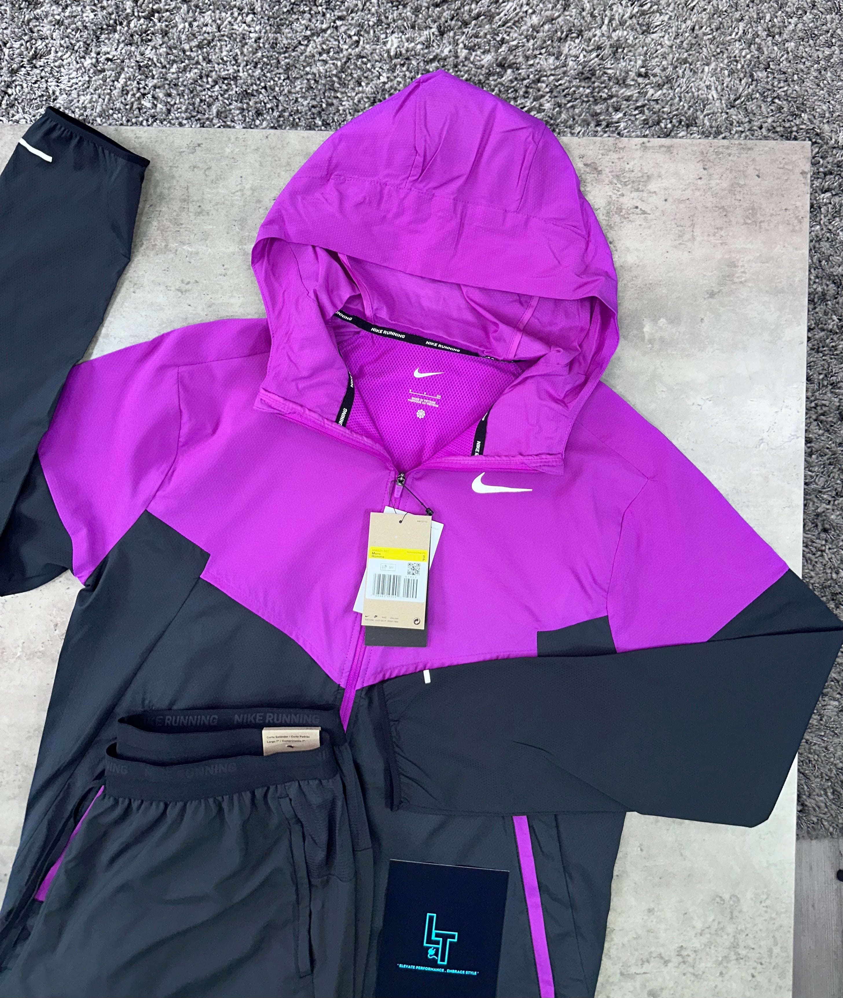 The SET in black and purple features a packable, super-lightweight jacket designed to water and block UV rays, offering reliable protection during runs. Its breathable fabric ensures comfort in variable conditions. The matching Shorts are crafted for freedom of movement with a lightweight, smooth feel and enhanced breathability at the upper back. A dedicated back pocket provides secure storage for your phone, combining functionality with performance for serious runners.